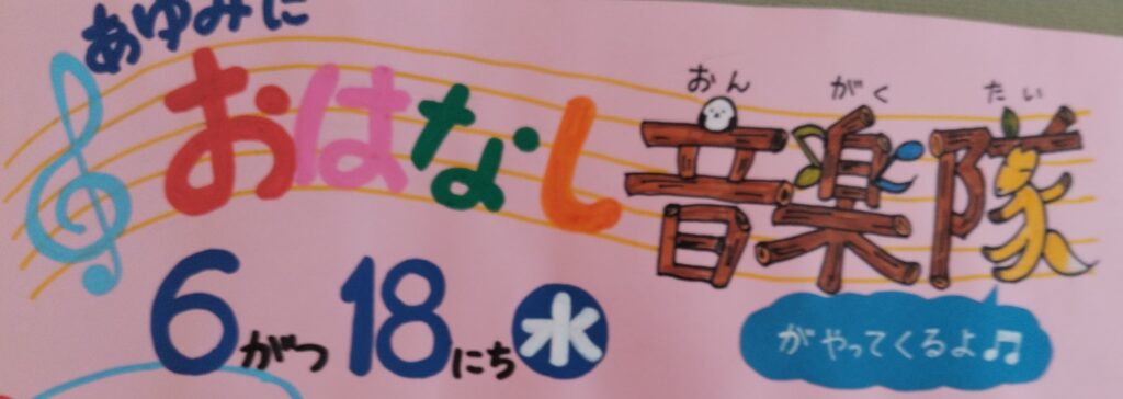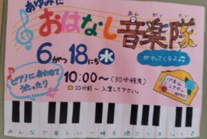 6月18日(水)10時~10時40分 「おはなし音楽隊」の公演します。 入場無料、予約不要です。10分前くらいに来てね。 おうたやぬいぐるみと遊びます。 0~2歳くらい対象かな。終了後はいつものように開けてます。