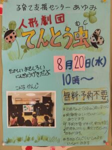 毎日暑さが続いてたまりませんね 今年も人形劇で楽しく遊びましょう 10時から40分ほどなので、来れる人は10分前くらいに来てください このころ(8月後半)には暑さも少しはましになるかなあ